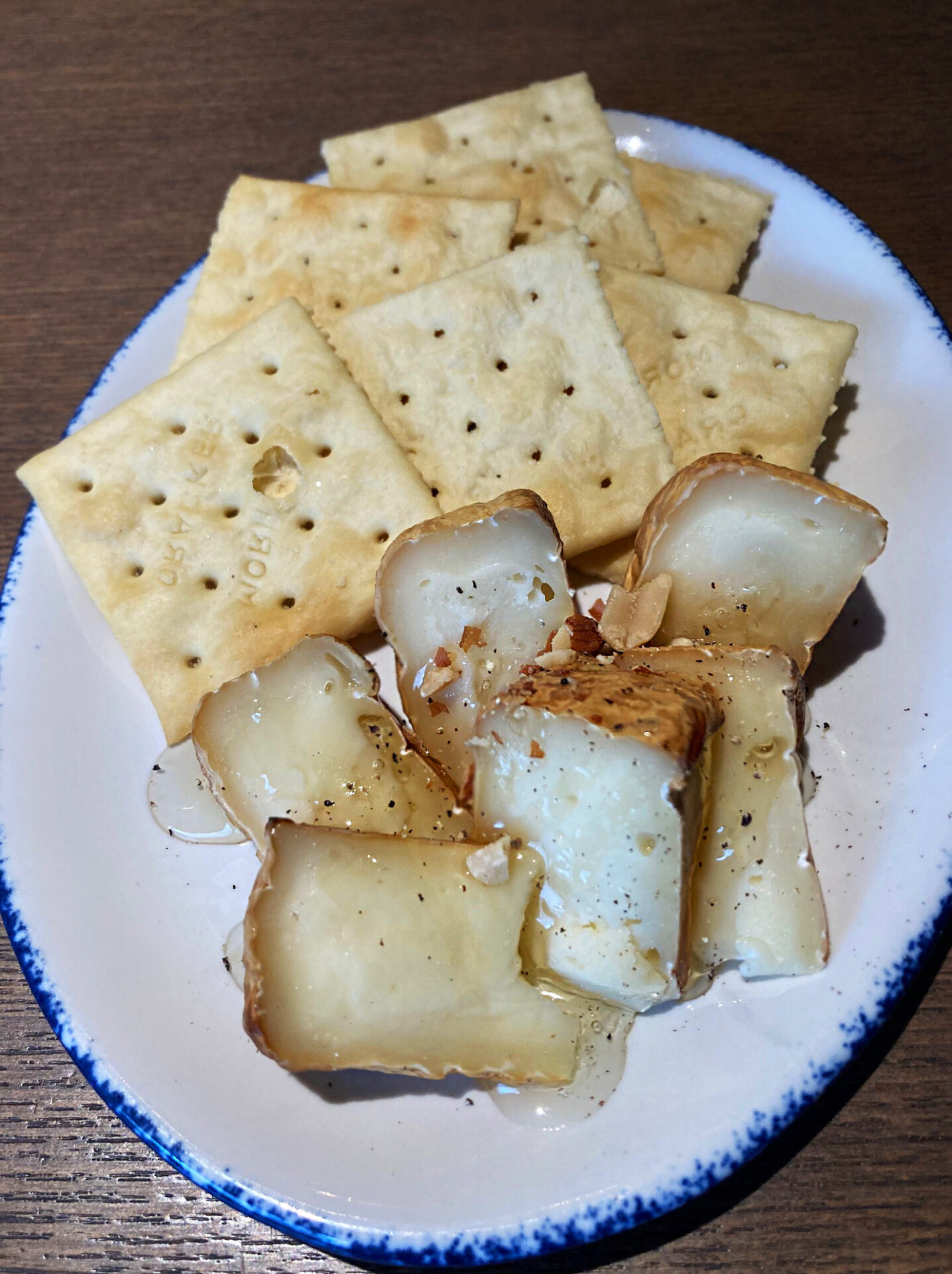クラッカーに、ハチミツ付けたチーズ乗っけてパクリ。喉の水分を奪われながらも美味!。
