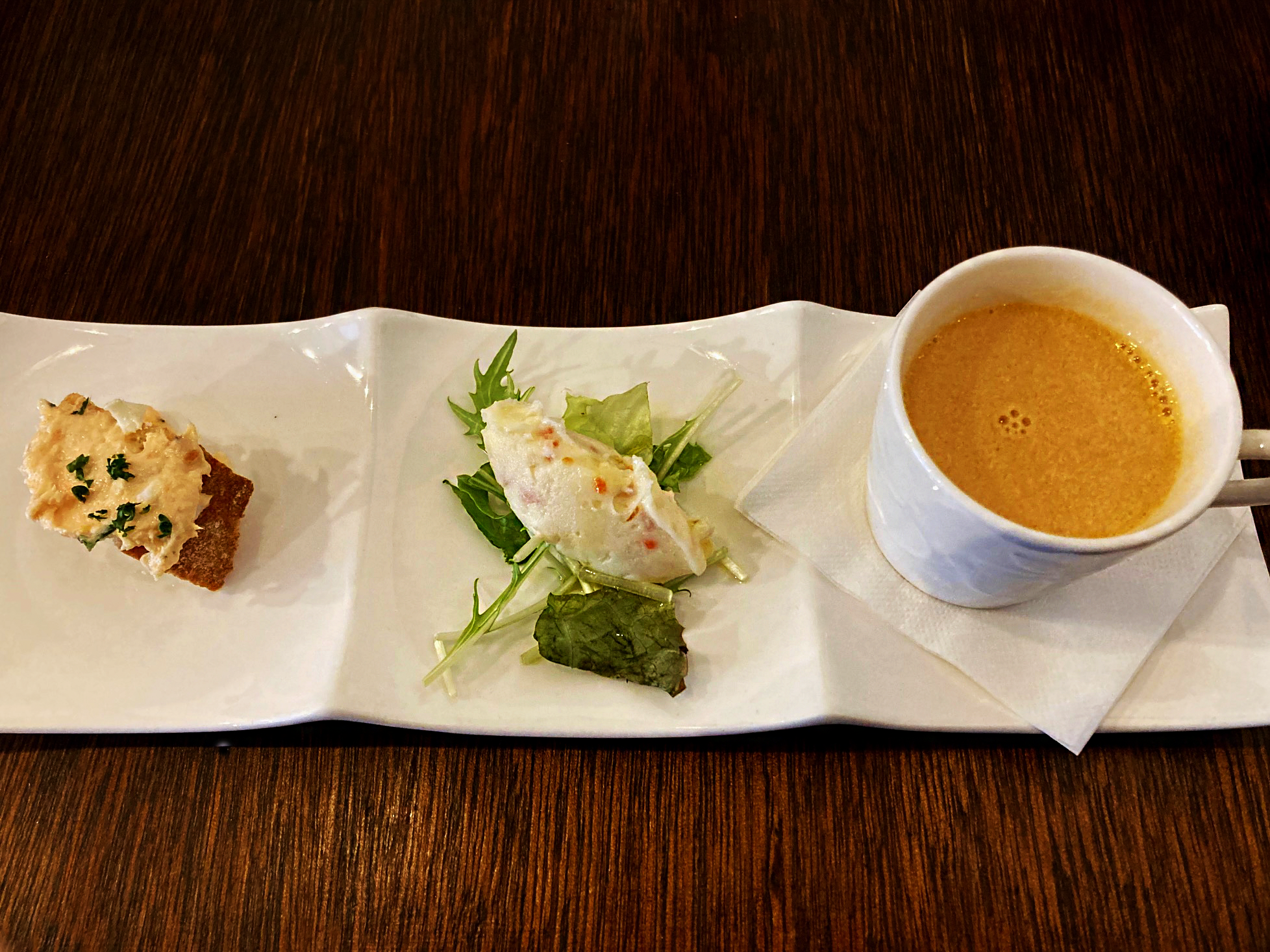 プルスケッタとポテサラだニャ。スープはトマトクリ~ムだったー。