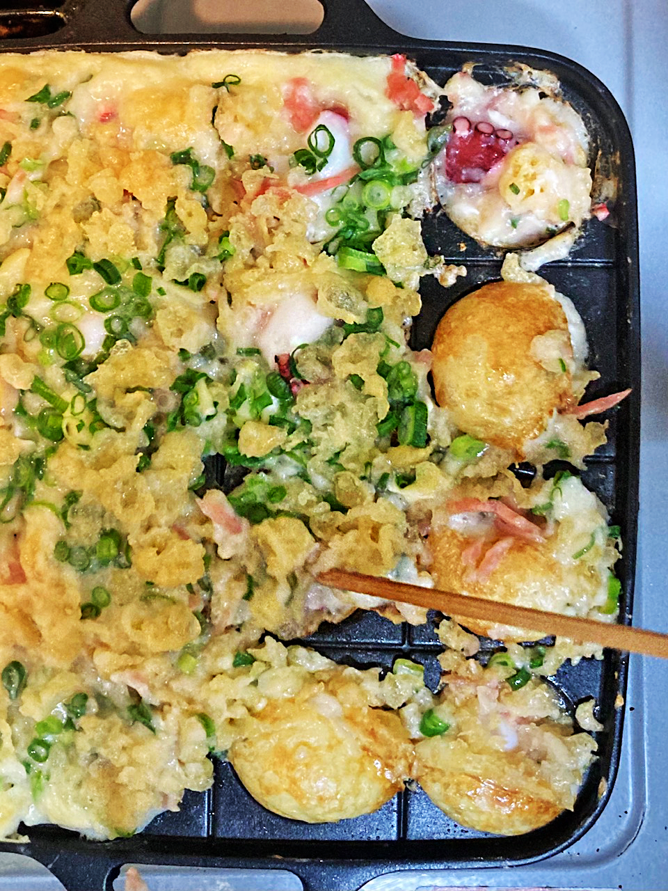 揚げ玉はたこ焼きの表面をカリッっとさせるのでふ。入れないと当然ふにやふにゃ。