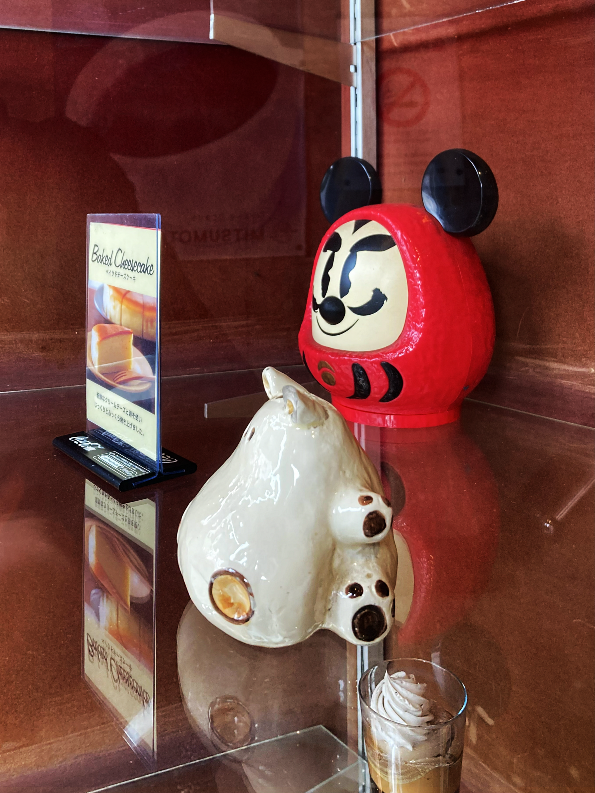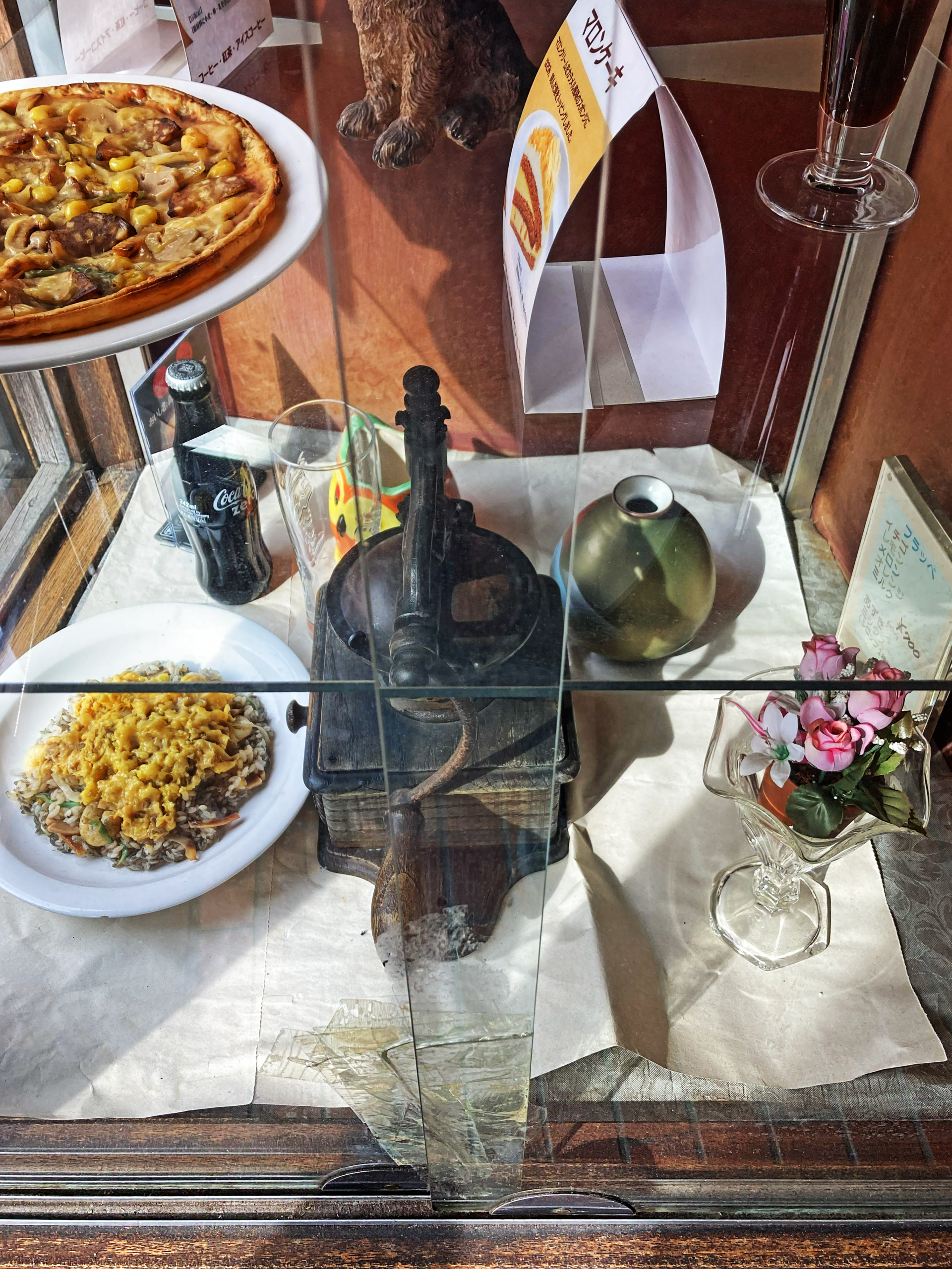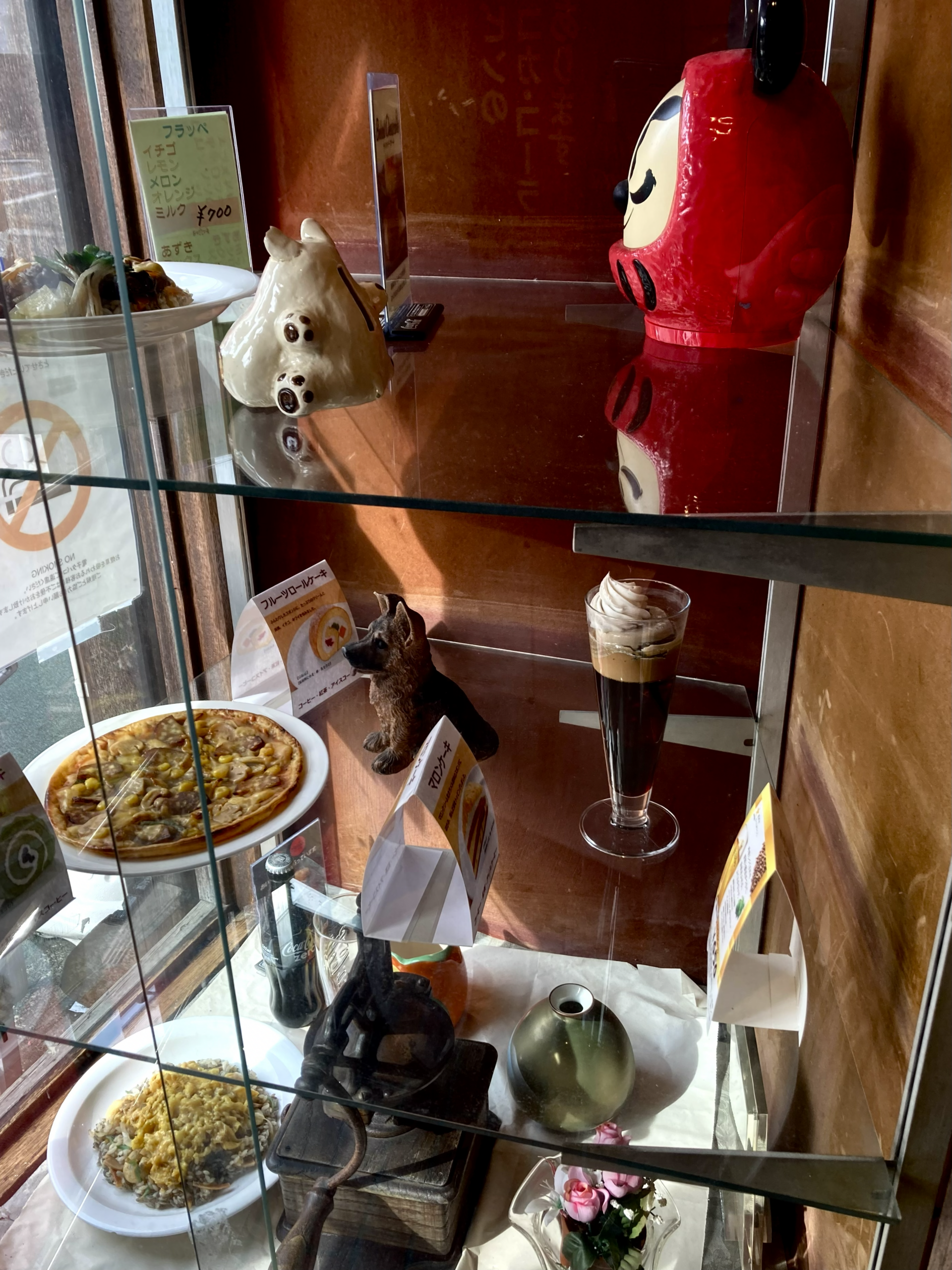 昭和レトロなお店のウィンドウディスプレイって、必ずこんなふーに意味なし置物が適当に放たれてンだよナー。