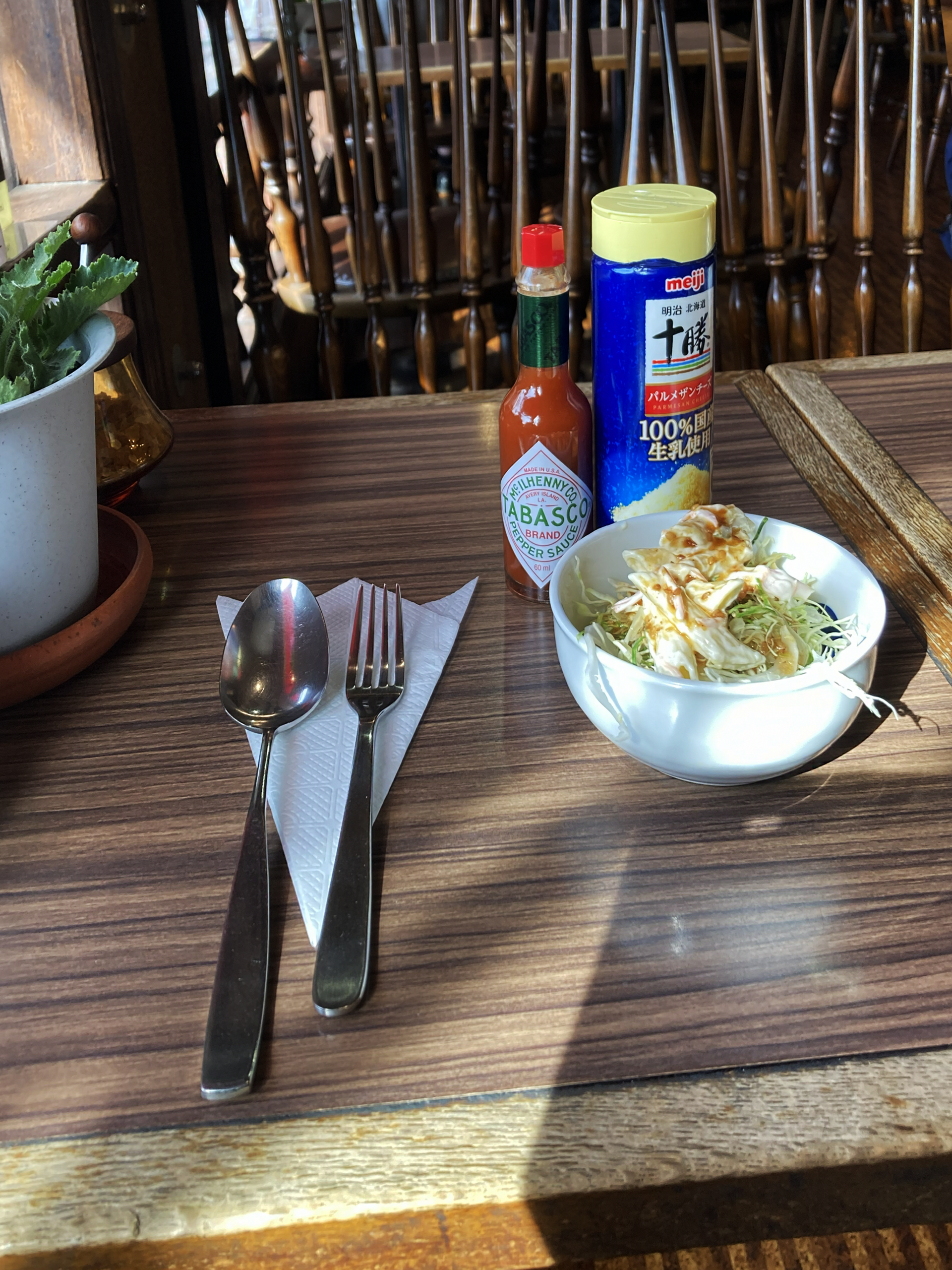 その映像めがけ、ご自由にふりかけてお召し上がりください、などと粋な計らいのタバスコとパルメザンチーズ。