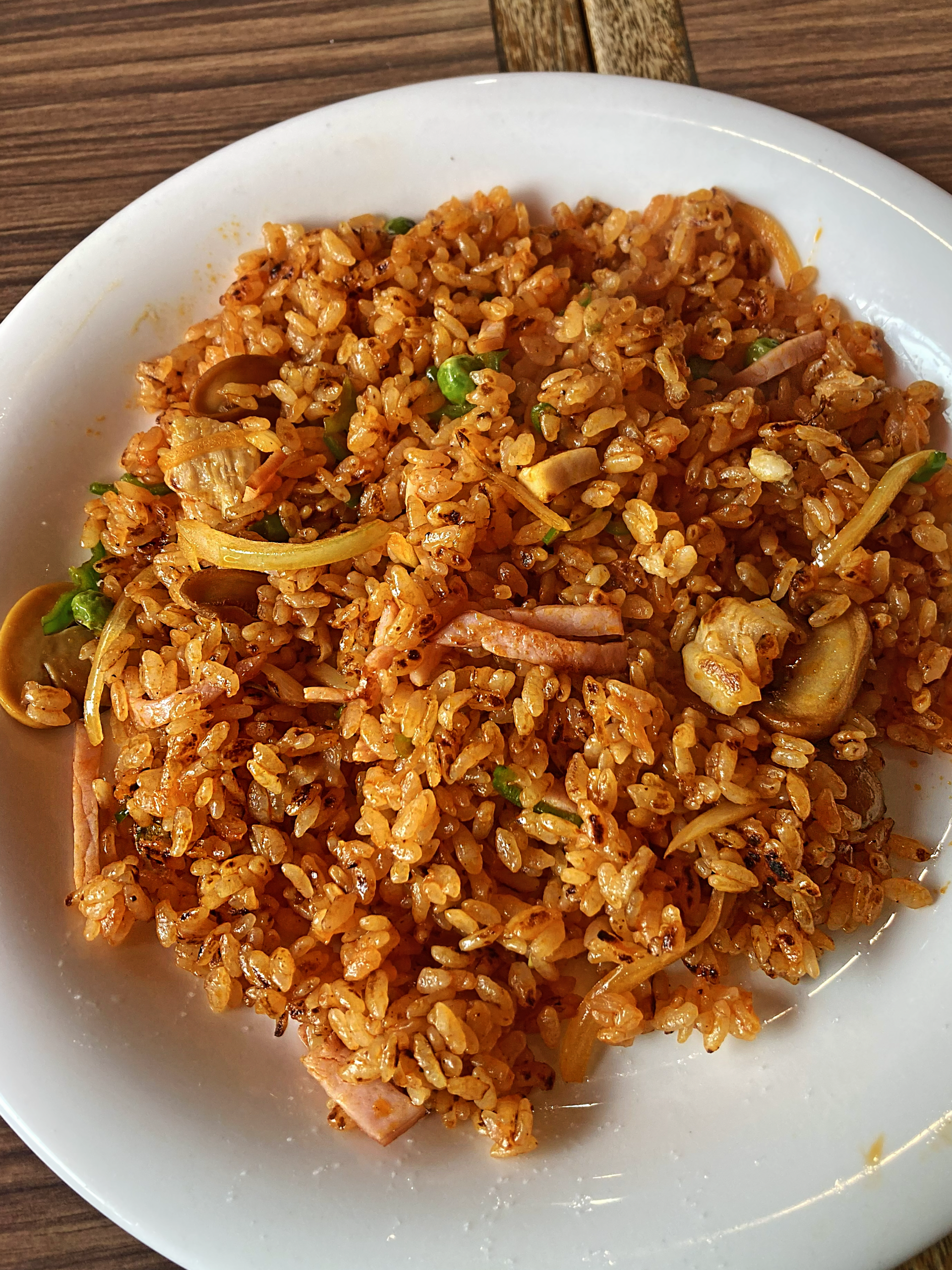 具材には玉ネギ、ポーマン、マッシュルーム、ハムの面々。そして忘れちゃならんのがグリーンピース。これが加わわりゃまさに王道の「チキンピラフ」!(何で?。何が?)。
