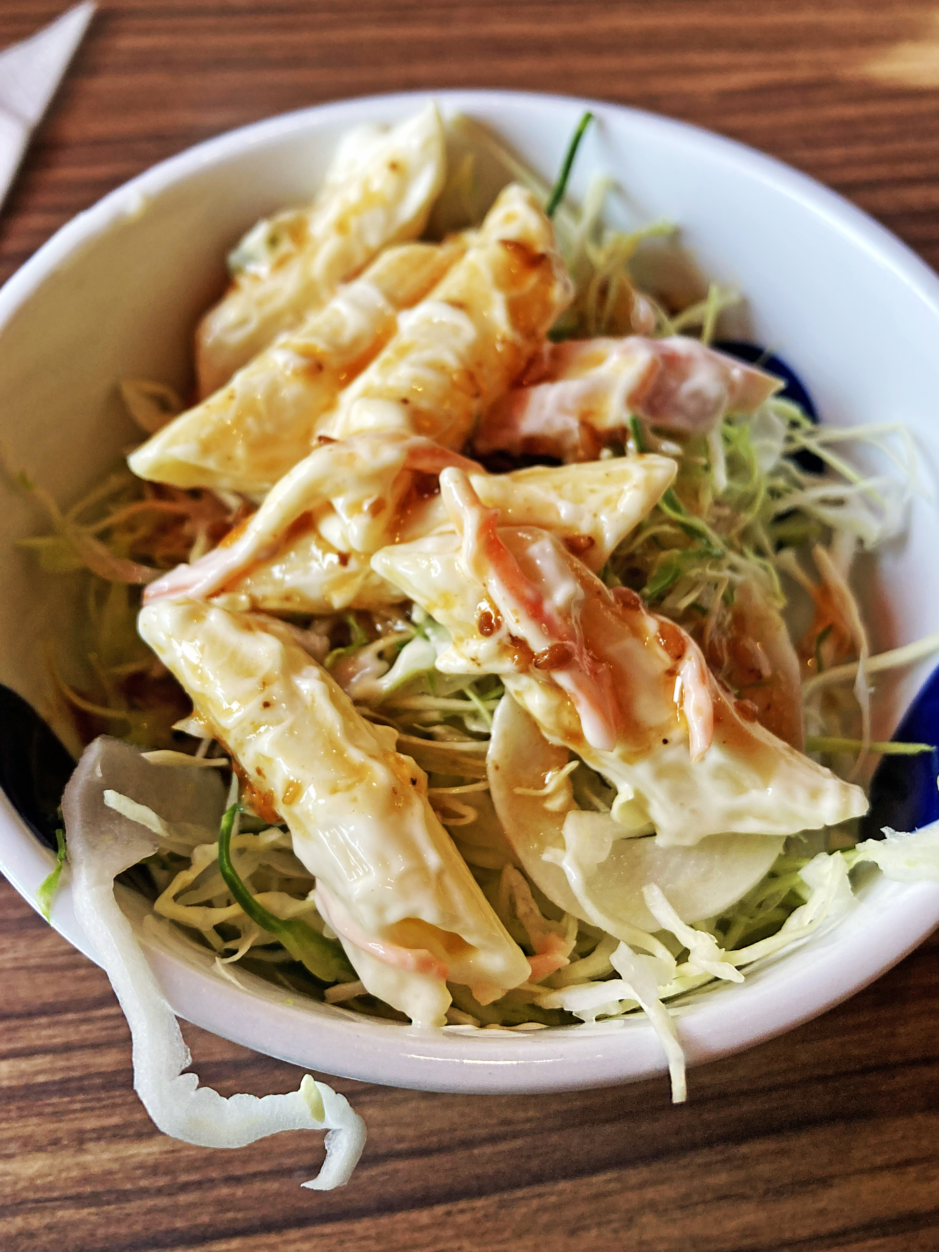 細切り千切りカベツの上にマヨ和えマカロニサラダ!。垂らしかけられるは自家製と思われる醤油ドレッシング!。
