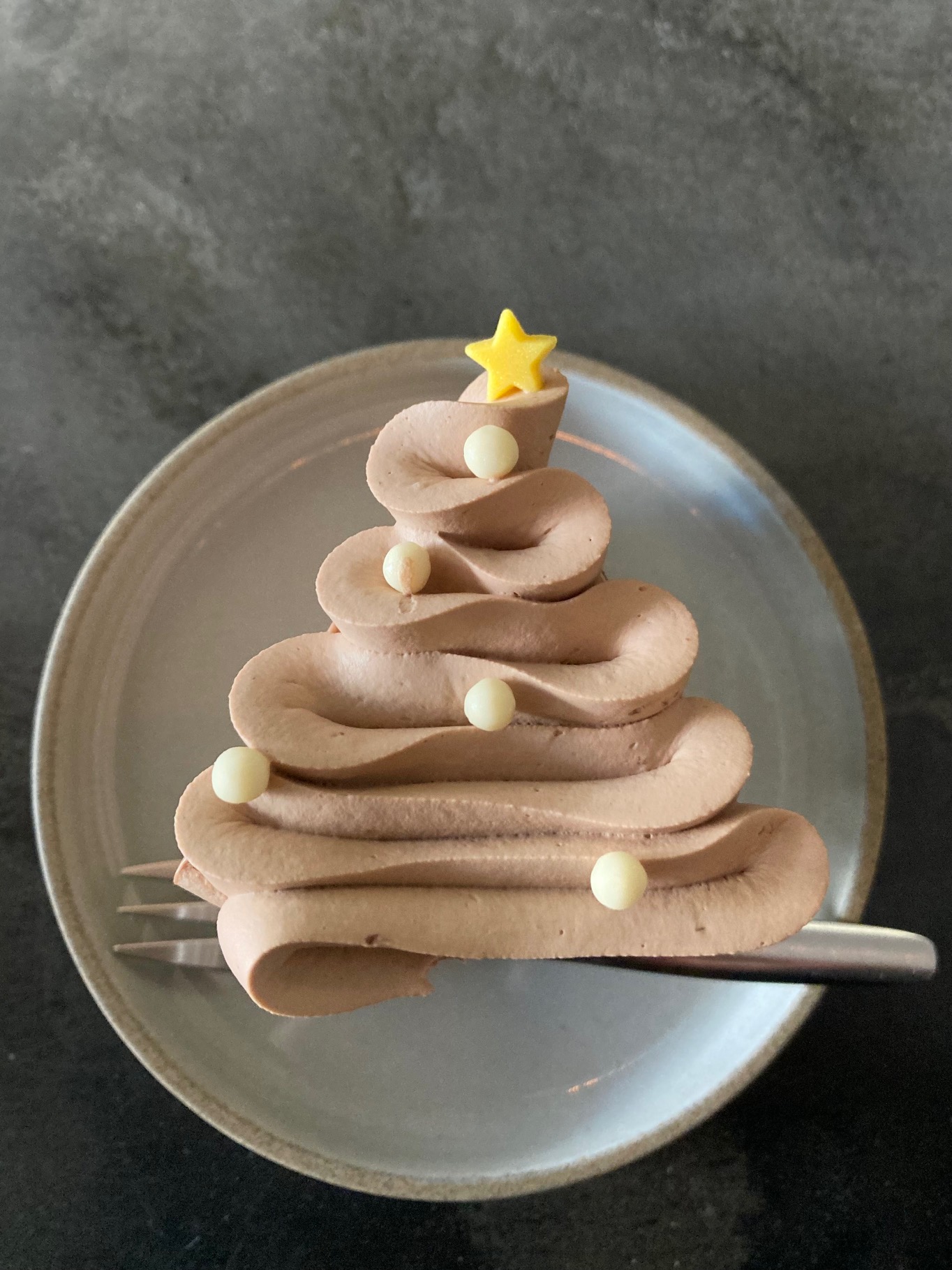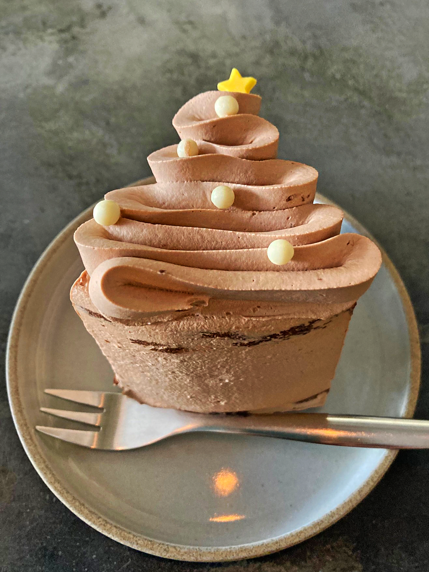 こぶりでまろやかなチョコケーキ、このデザインがなかなか秀逸。