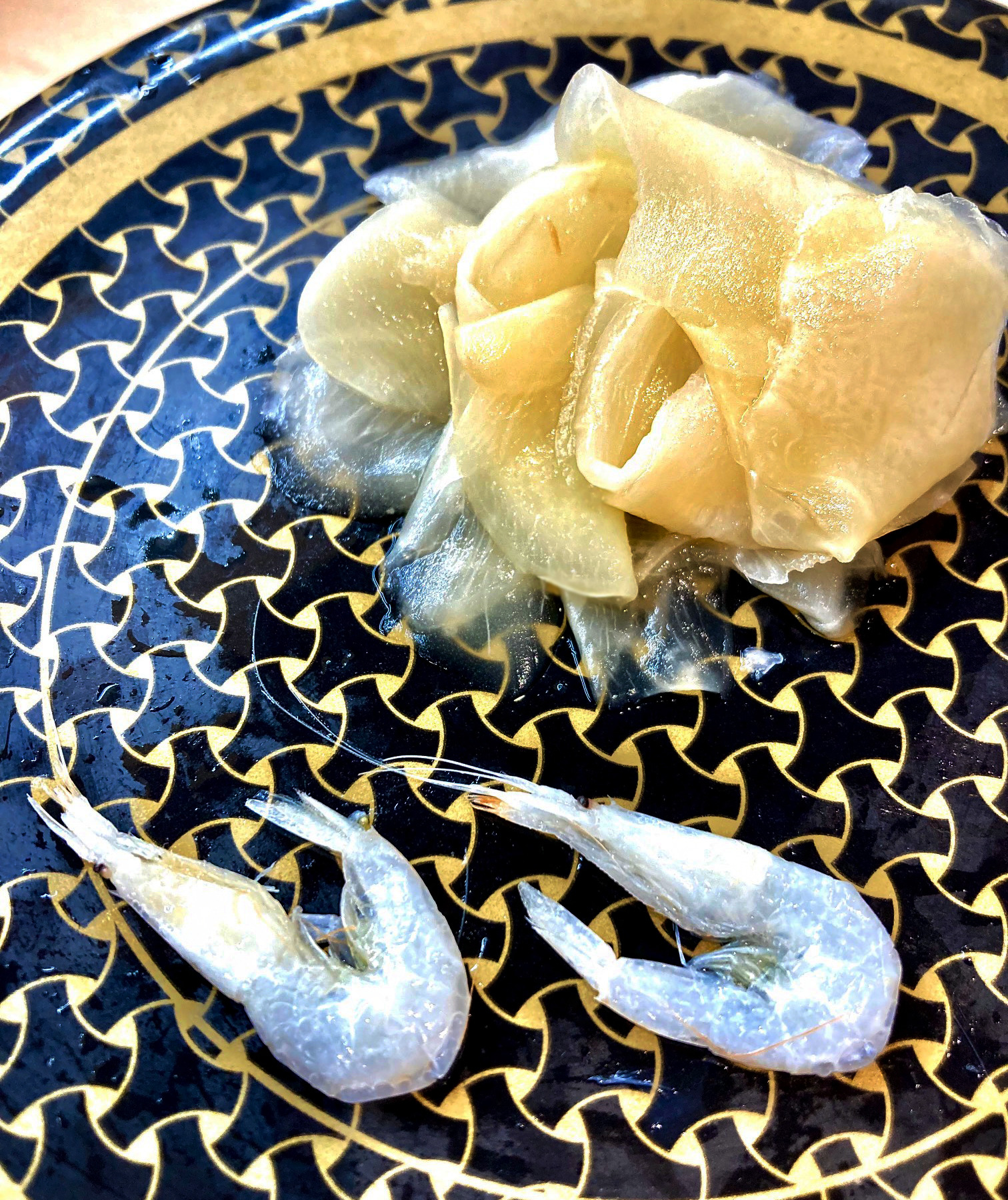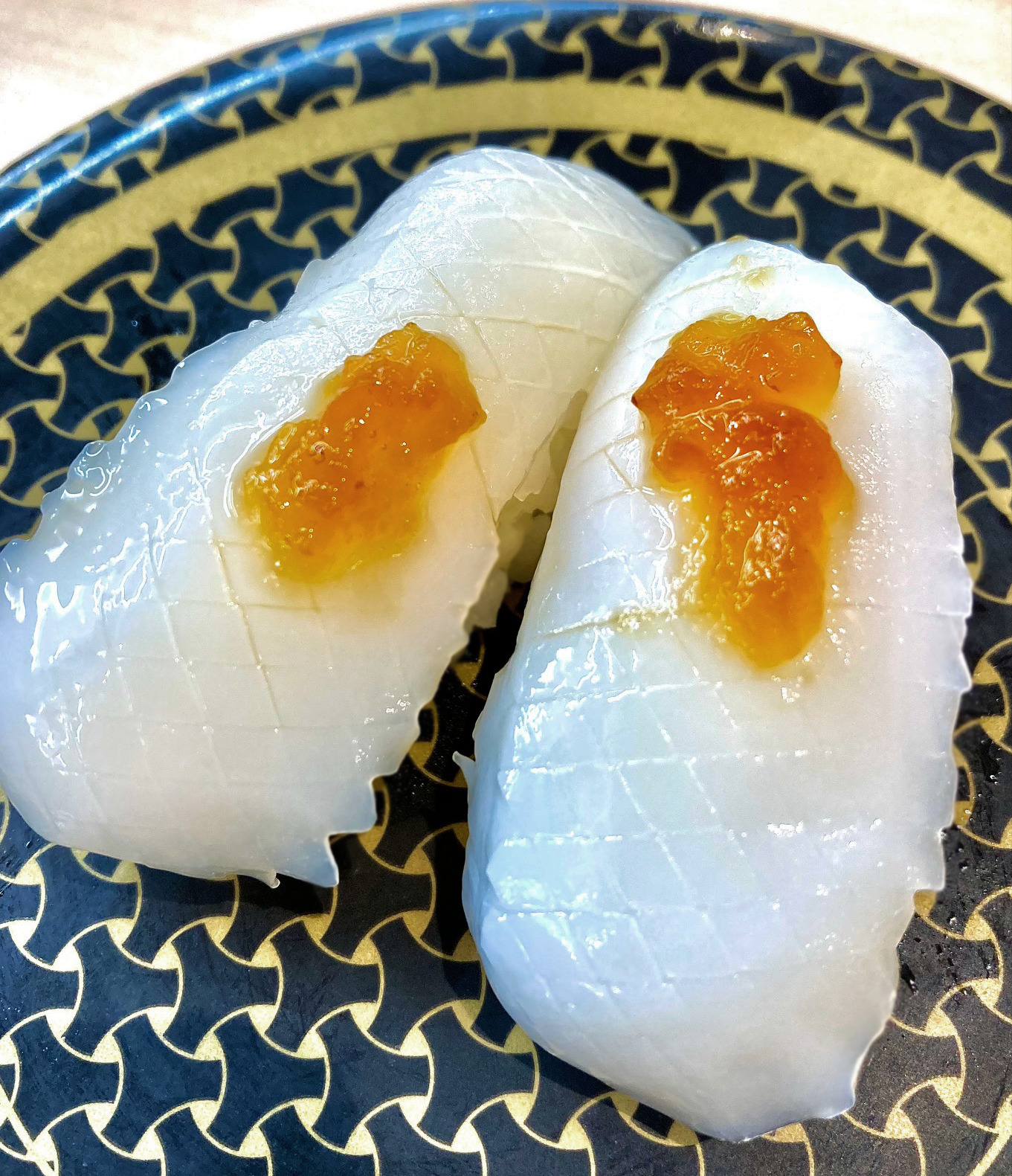 イカは視覚的には一直線なネタだから、チョッとしたアレンジで目を楽しませて味覚の起爆剤にしたいよね。