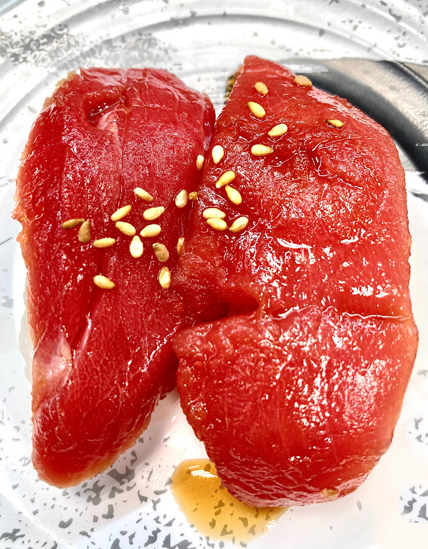 続いて来たのは漬けマグロ!。やっぱりマグロの漬けは白ゴマが命だにゃあ~。おいちい~。