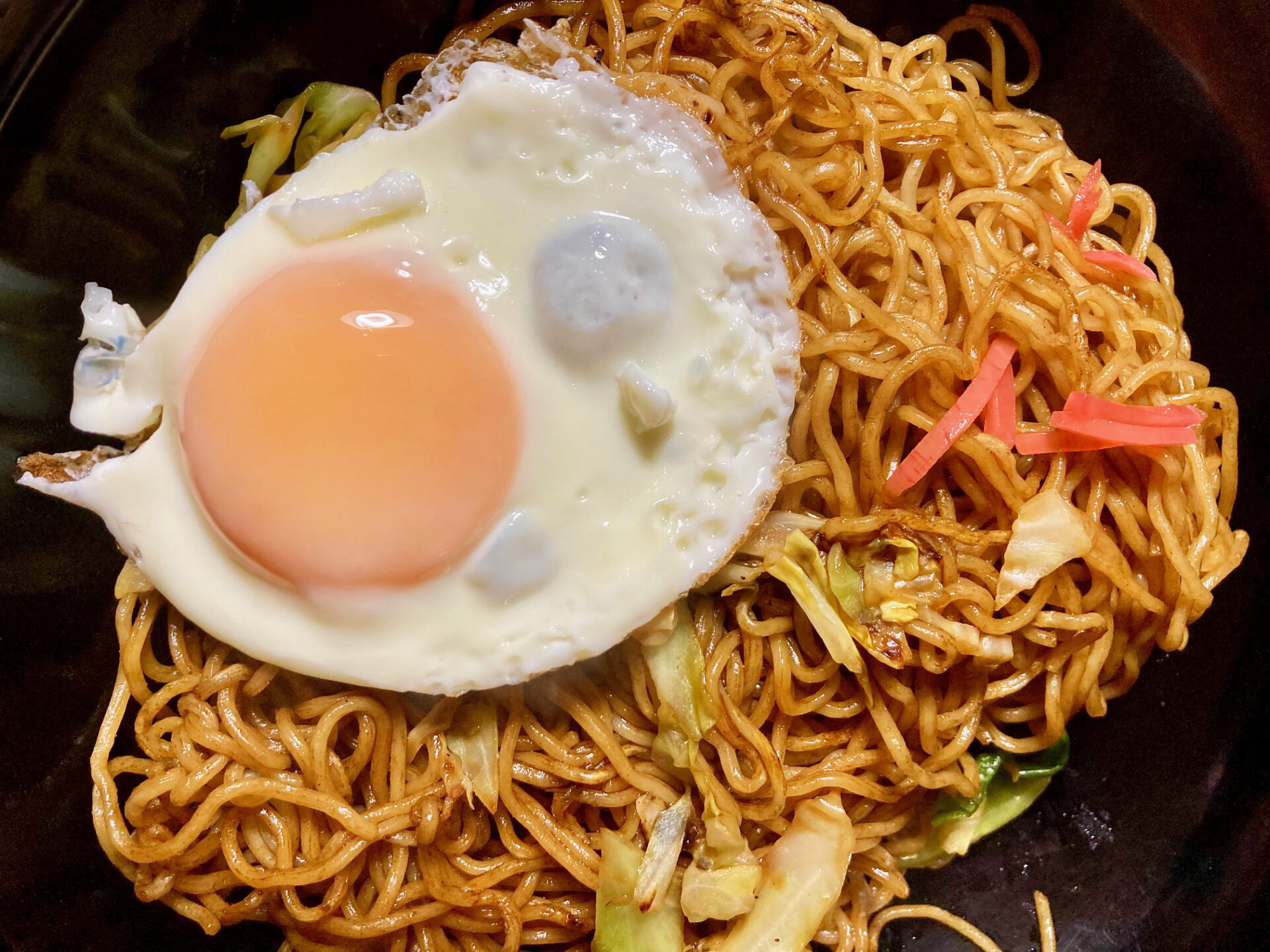 夕飯は軽めにして月見焼きそばにしちゃったのほほ~。