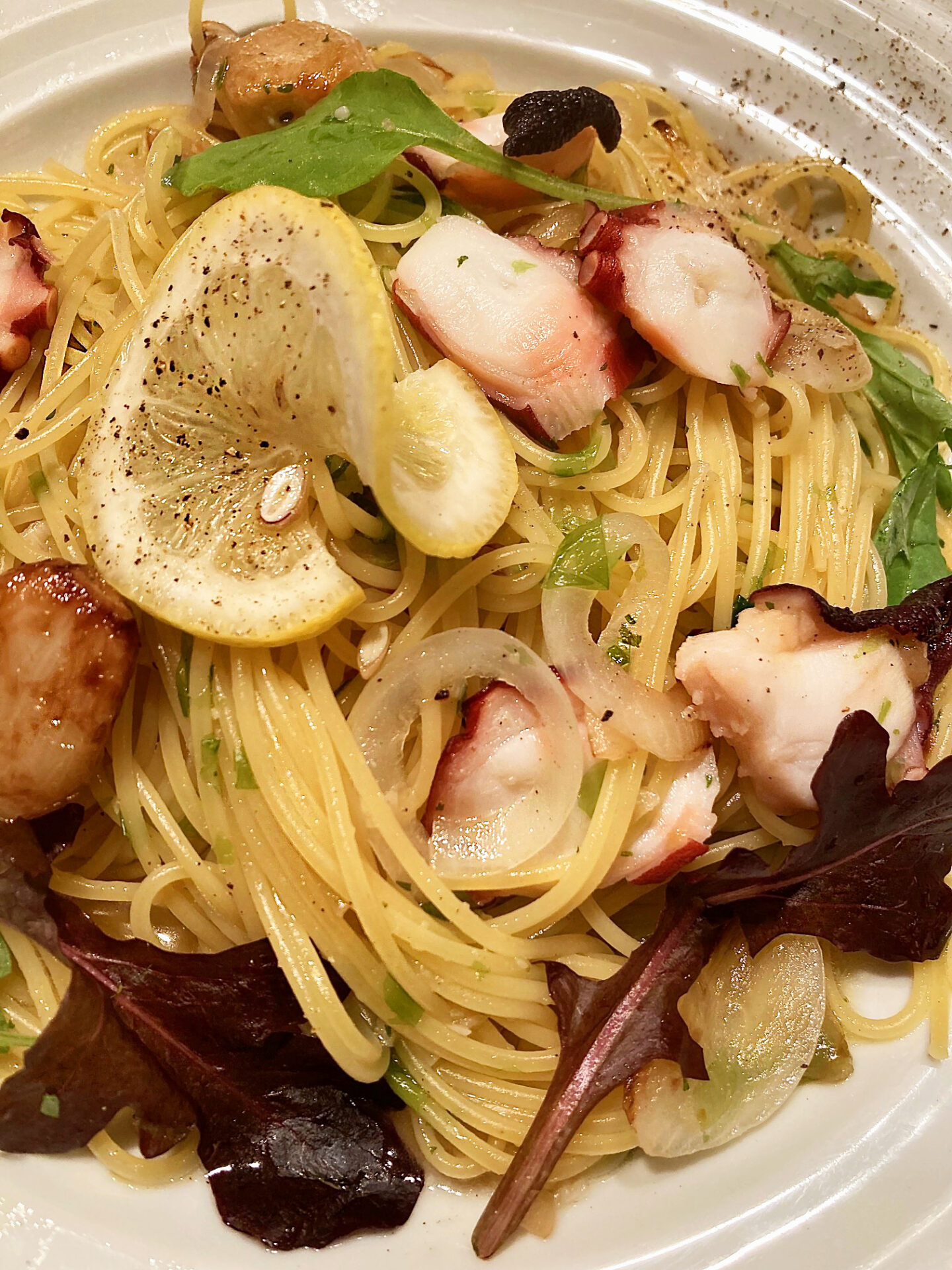 黄色い乾麺パスタにタコのワインレッドカラーがよく映えてるね~。