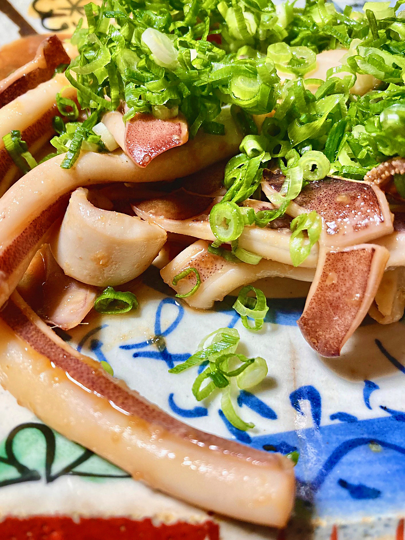帰宅して夕飯はスルメイカのバター醤油炒め!。青ネギとの相性はグンバツ!。