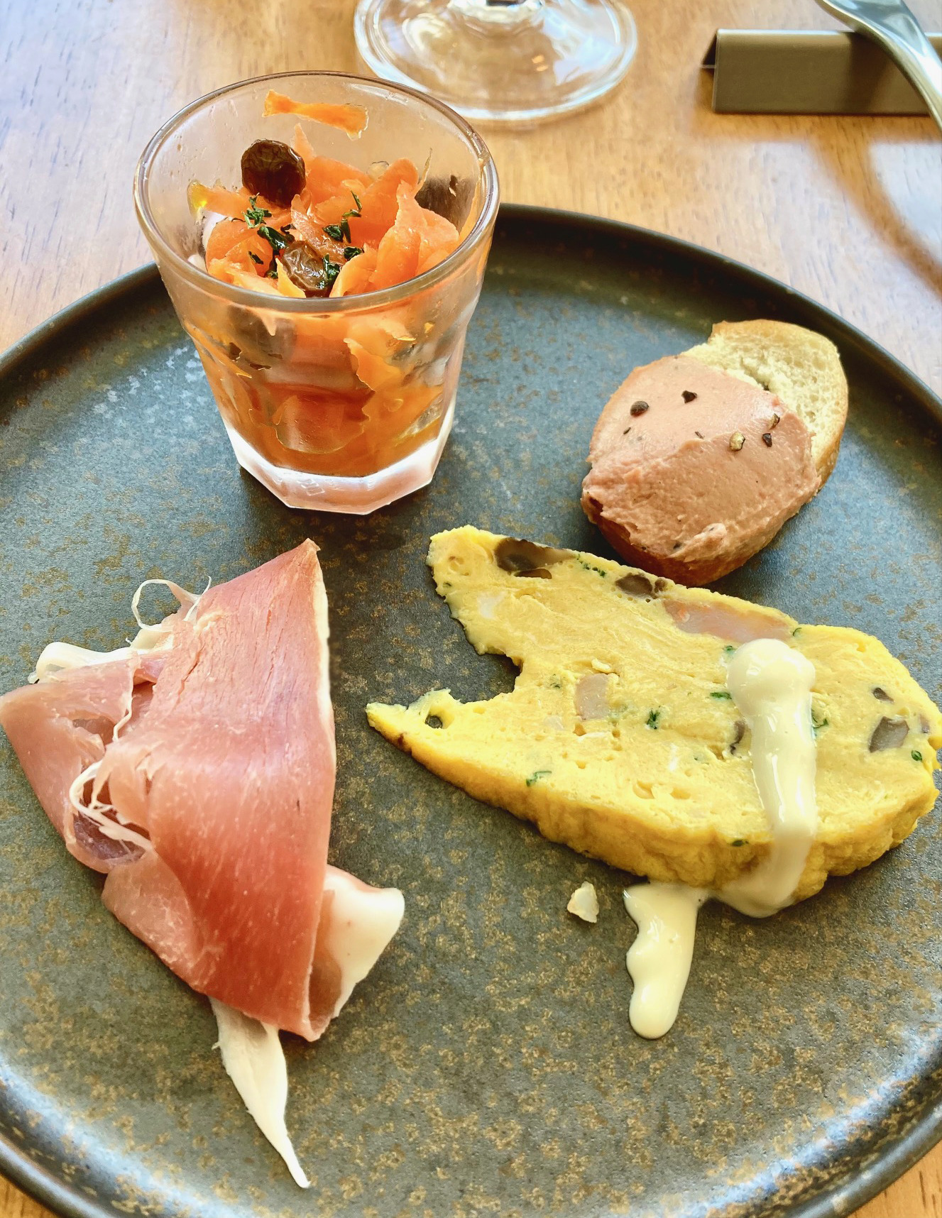 スペインの卵焼き、肉のペースト塗った固いパン、生ハム、