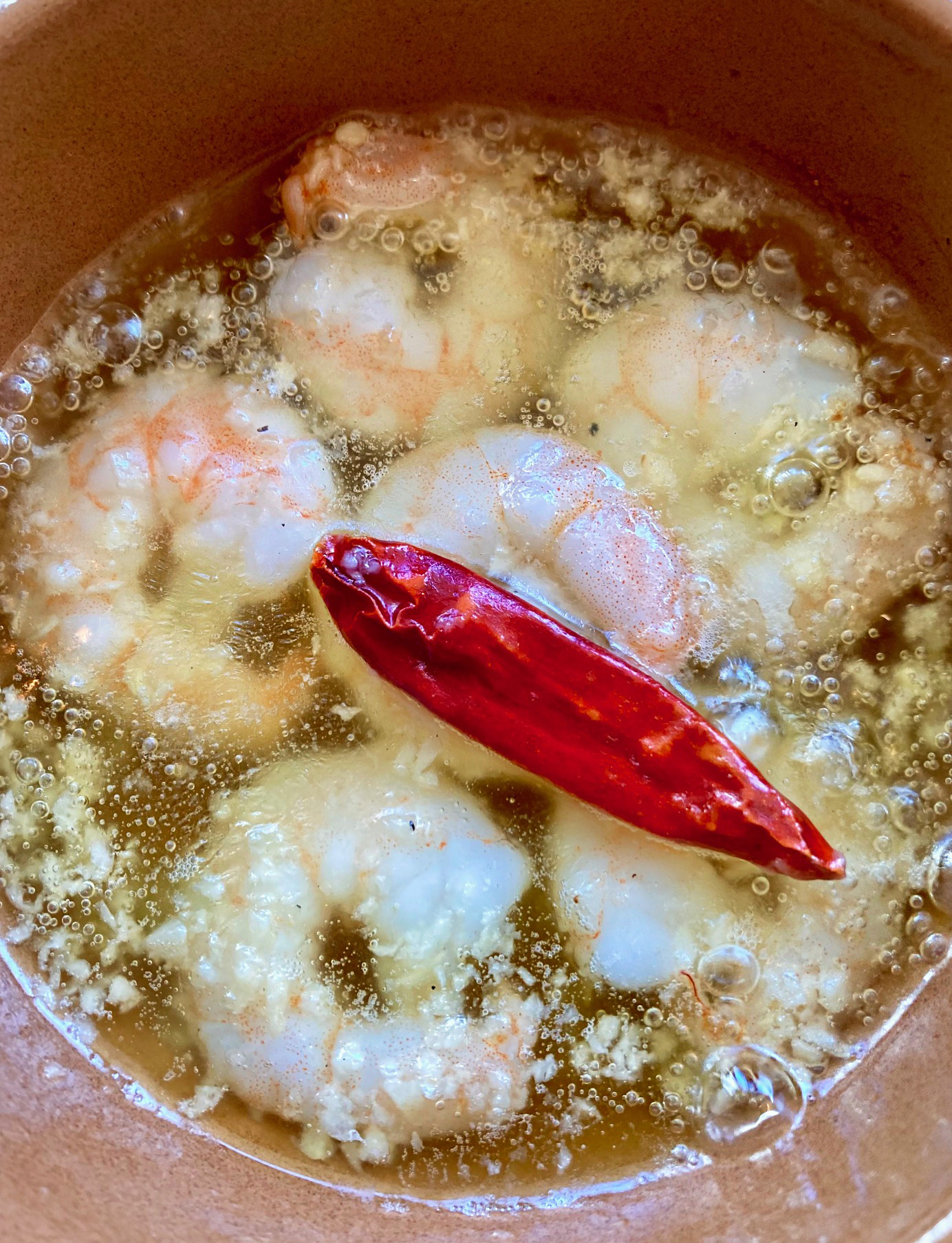 クツクツと沸騰するオリーブオイルの中、かすかにリズムをとるエビ6尾!。