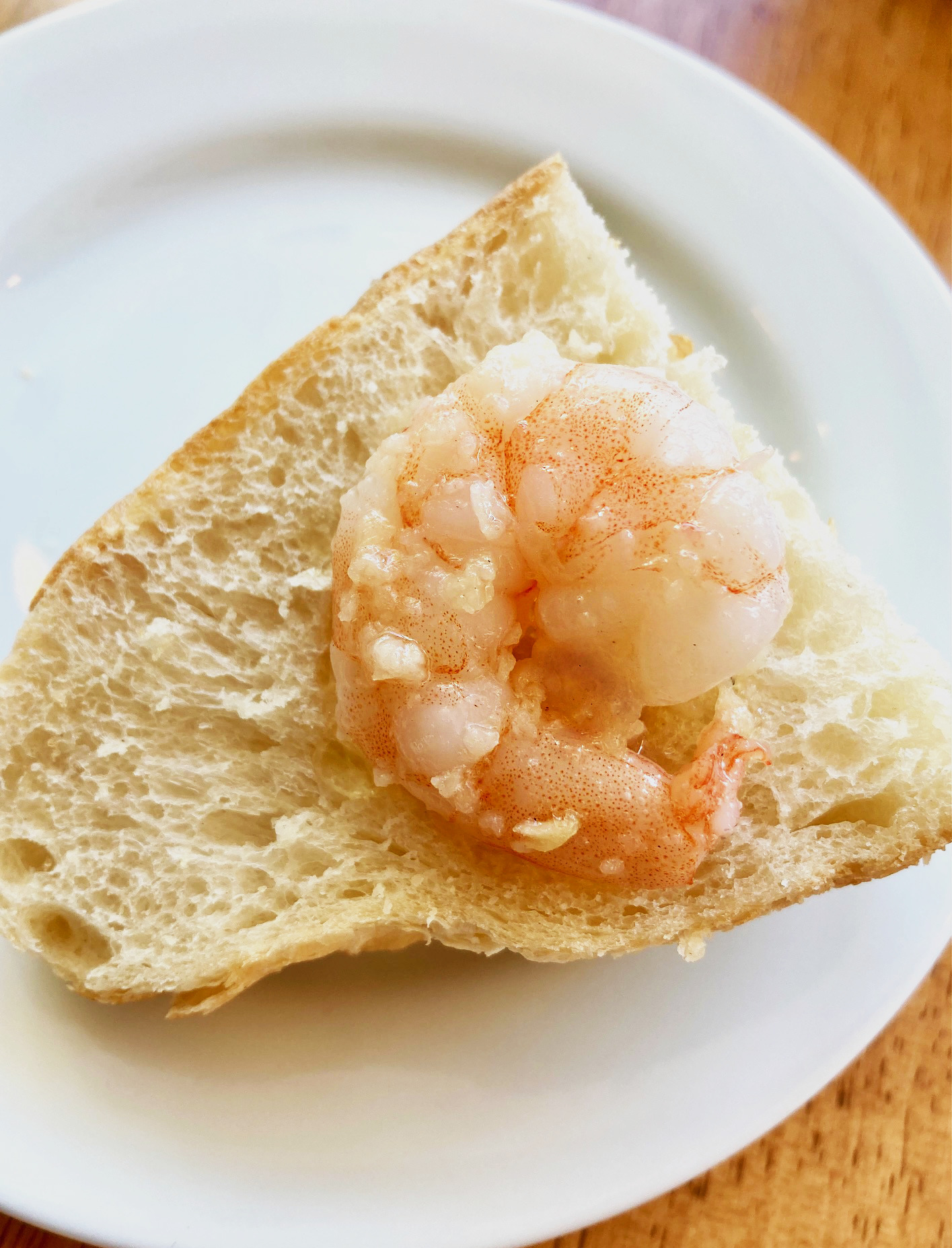塩味の効いたスペインパンにエビを乗っけていただくと、