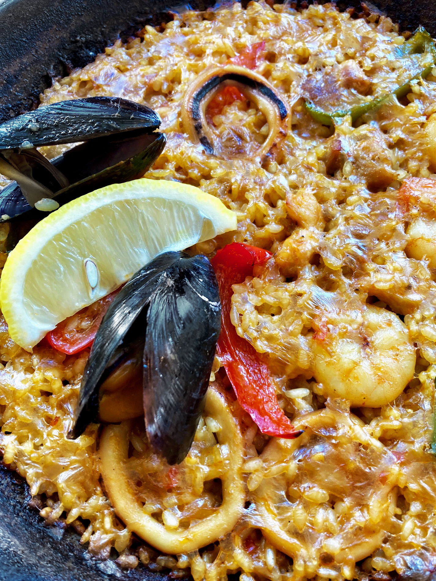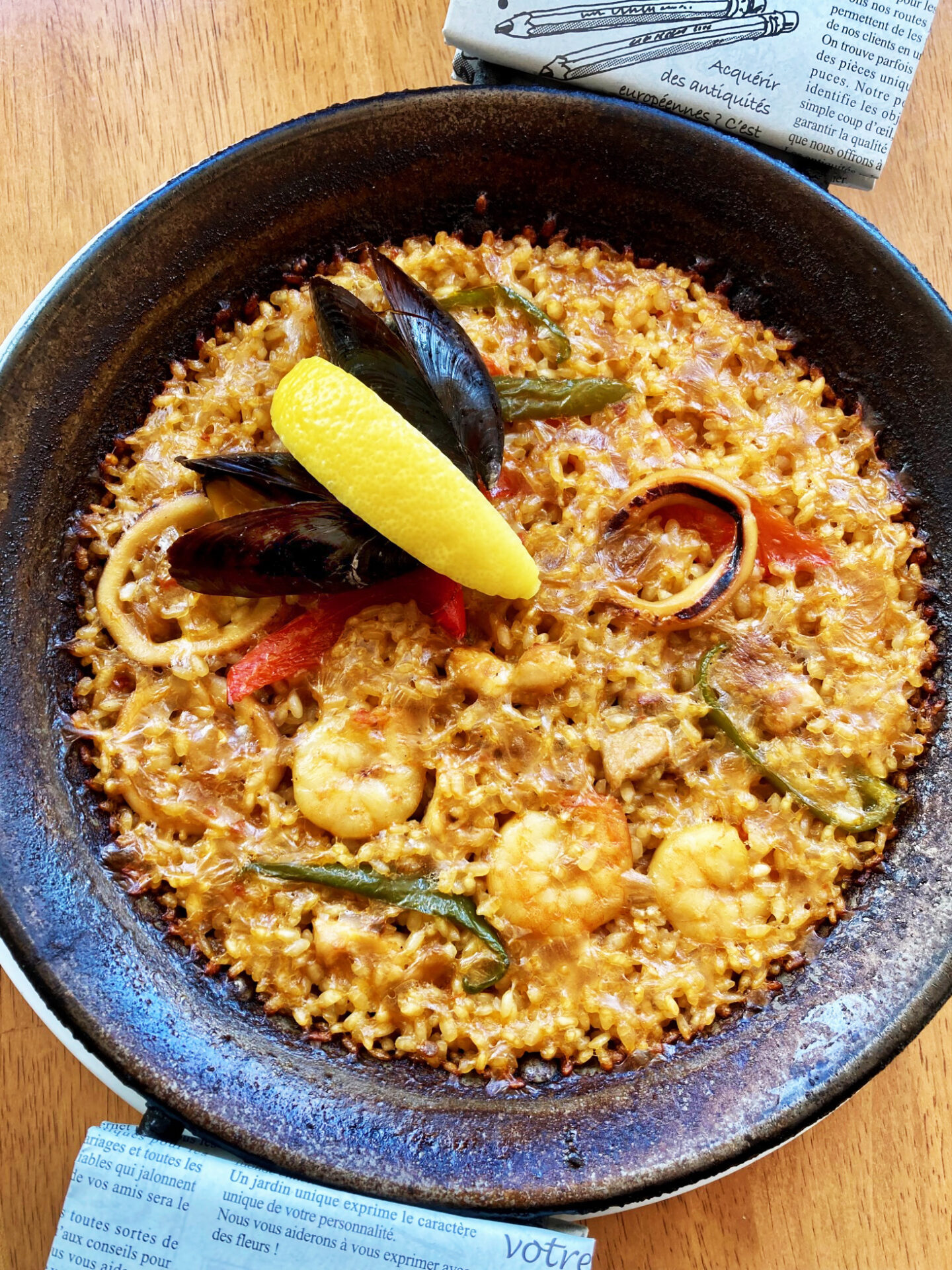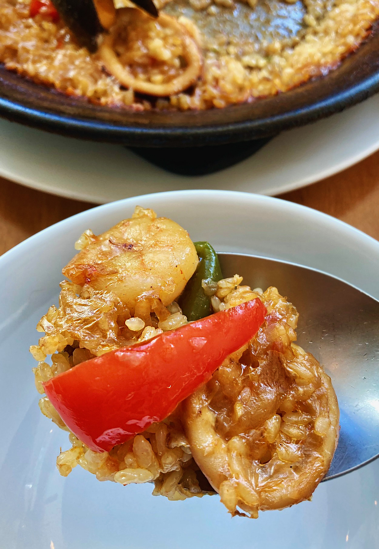 ムール貝、イカ、鶏肉、エビの具材入り。米は固くてシンがあるっぽい食感。