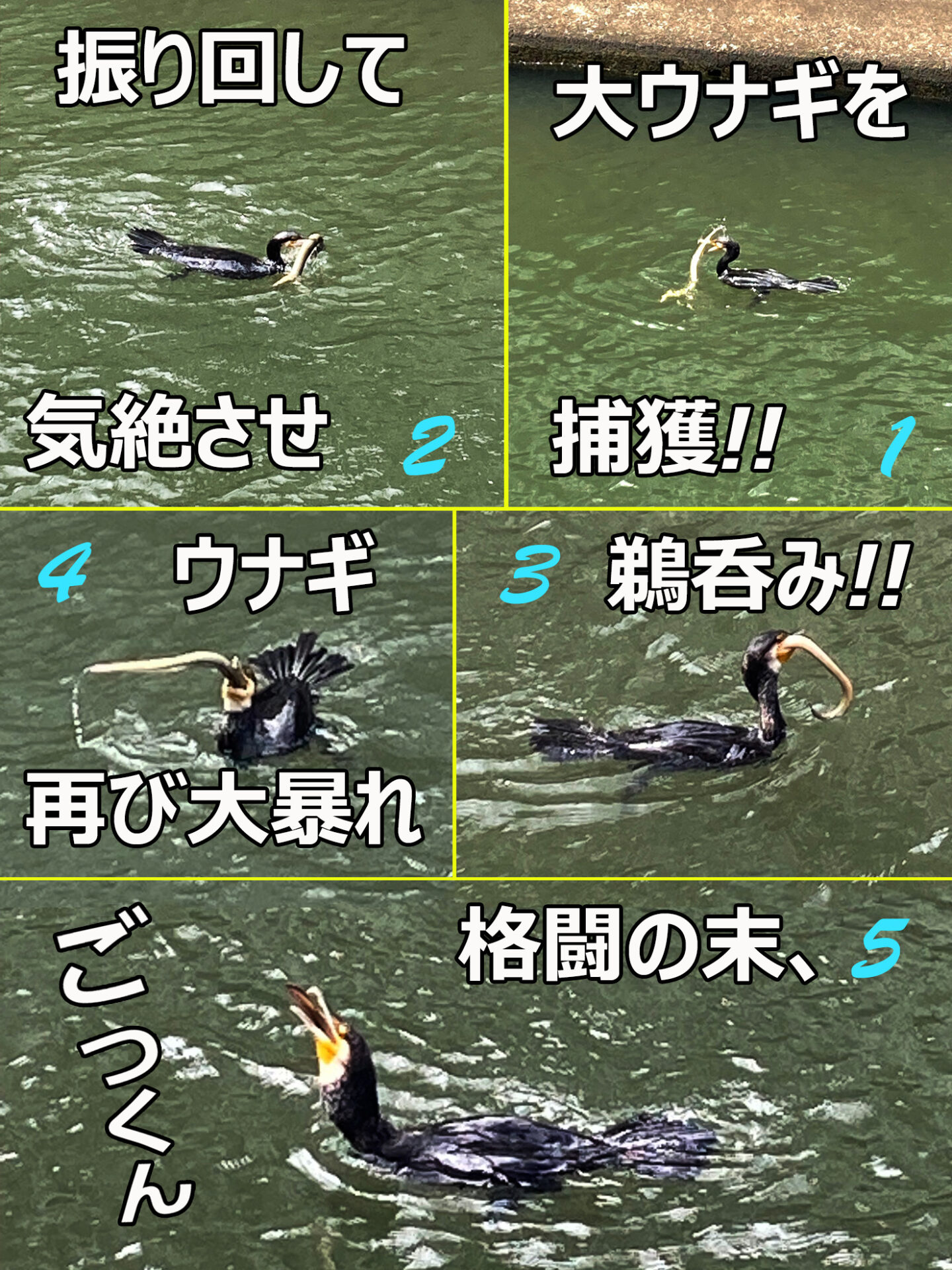 川鵜(かわう)だか海鵜(うみう)だか分からないが、このお方は今まさに大物ウナギを捕獲した直後であった!。