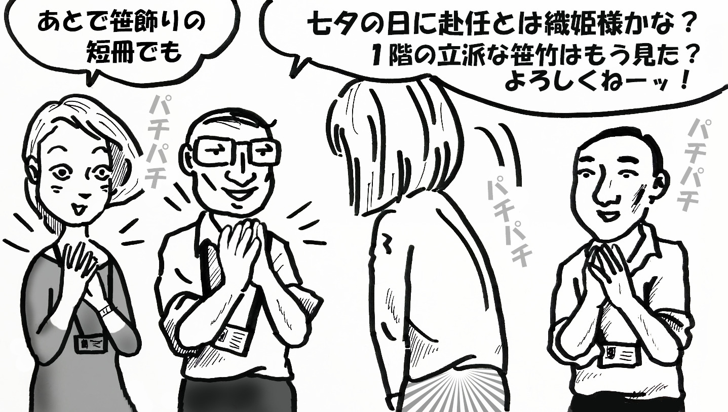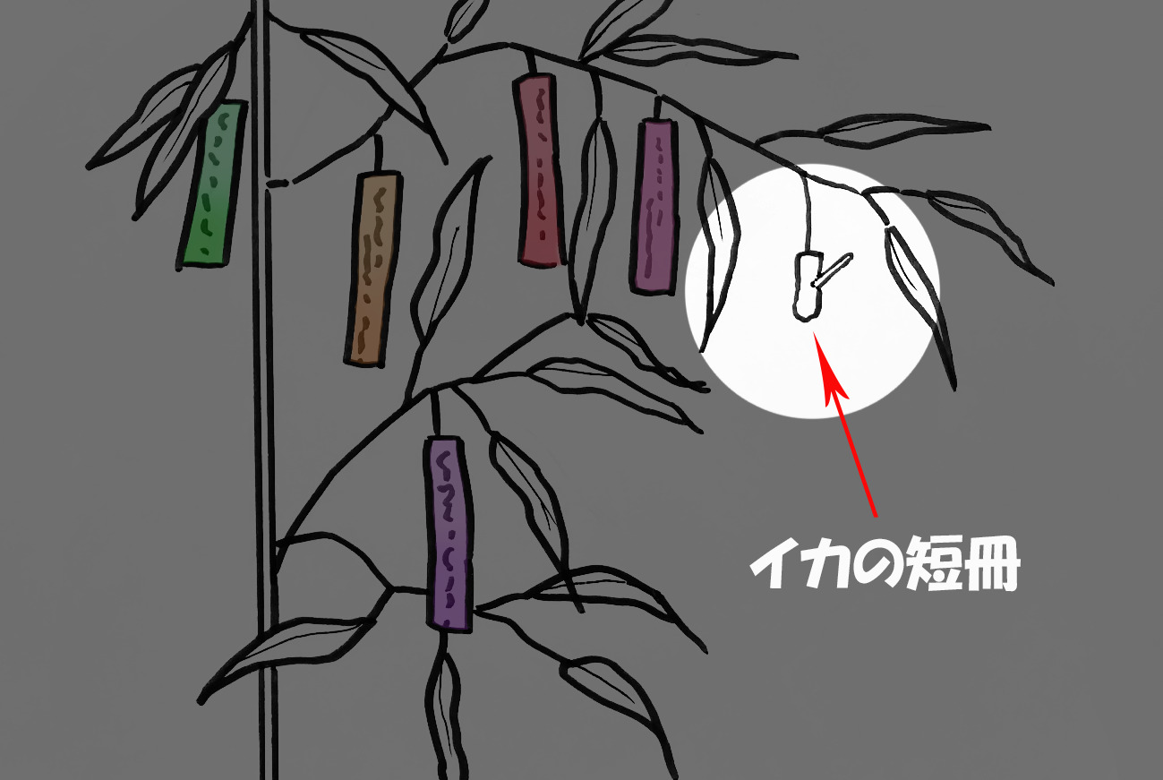 「早く結婚出来ますように」 横のタンザクとイカ同文。願掛け言葉のかわりにツマヨウジ添え。