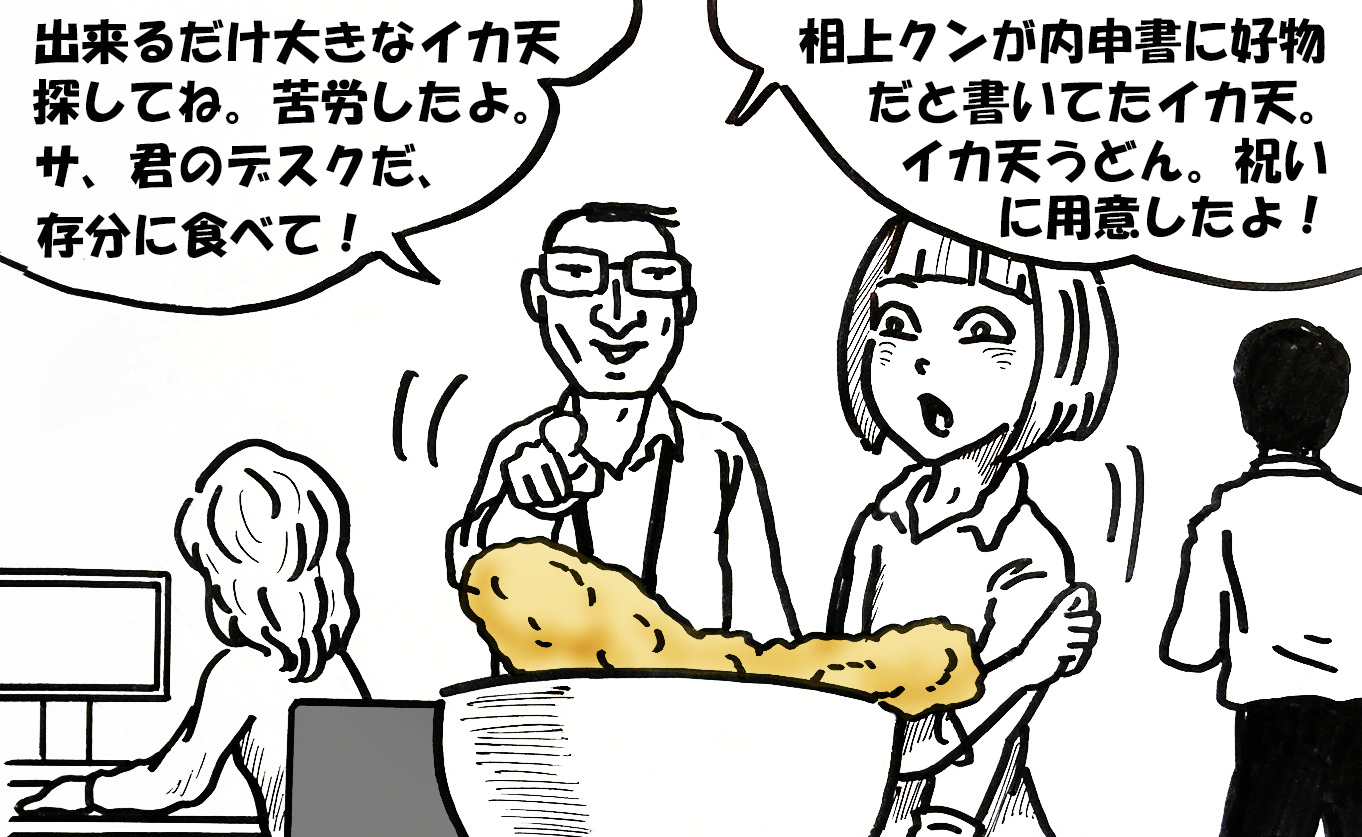 にしても、天ぷらうどん食べてて、時々コロモのサヤからイカのカタナを抜いたことありません?。小さなタンザク形のイカを一瞬でも口にくわえた状態になると、アレって遠見からはホイッスルをくわえてるみたく見えるものなの?。