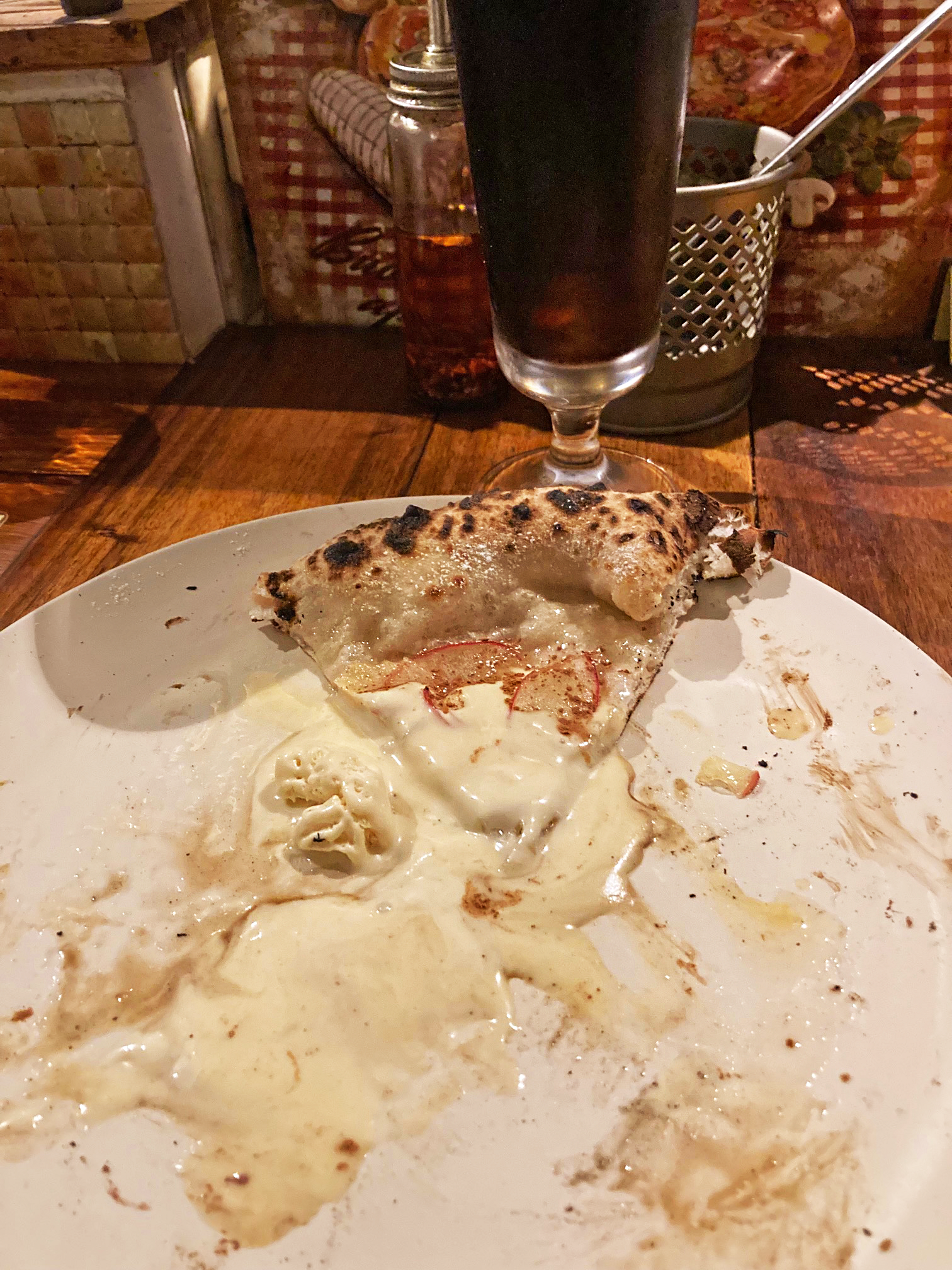 焼きリンゴの薄さを溶けたアイスシロップが包み込み、たまらなくもっちもちの弾むピッツァ生地へと引き継いでゆくゥ~♪。