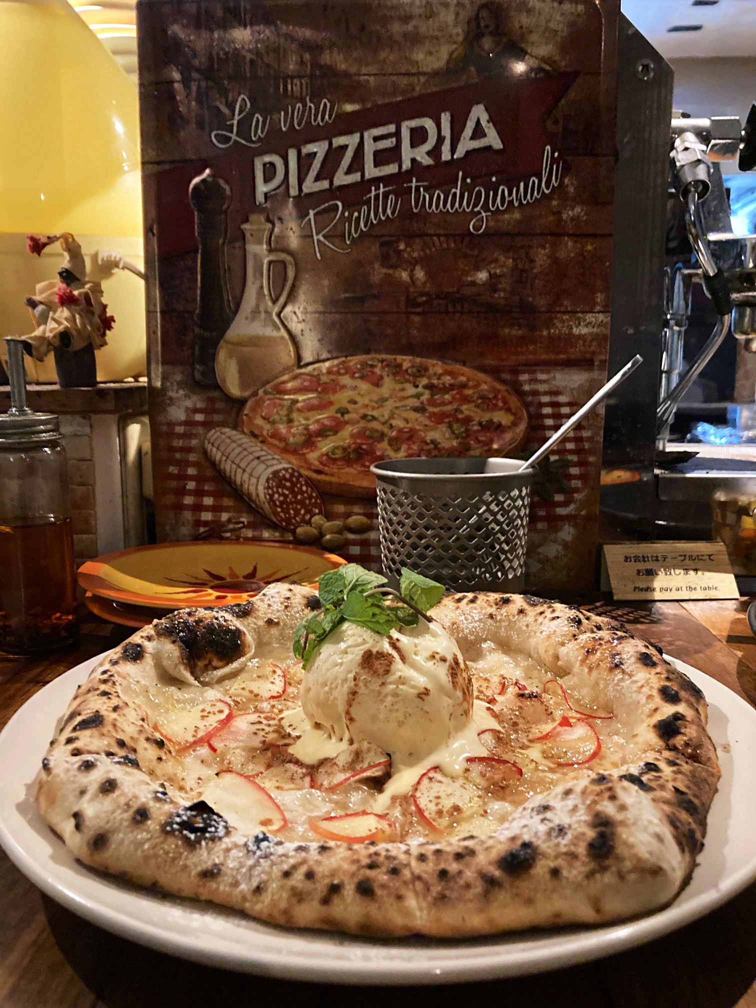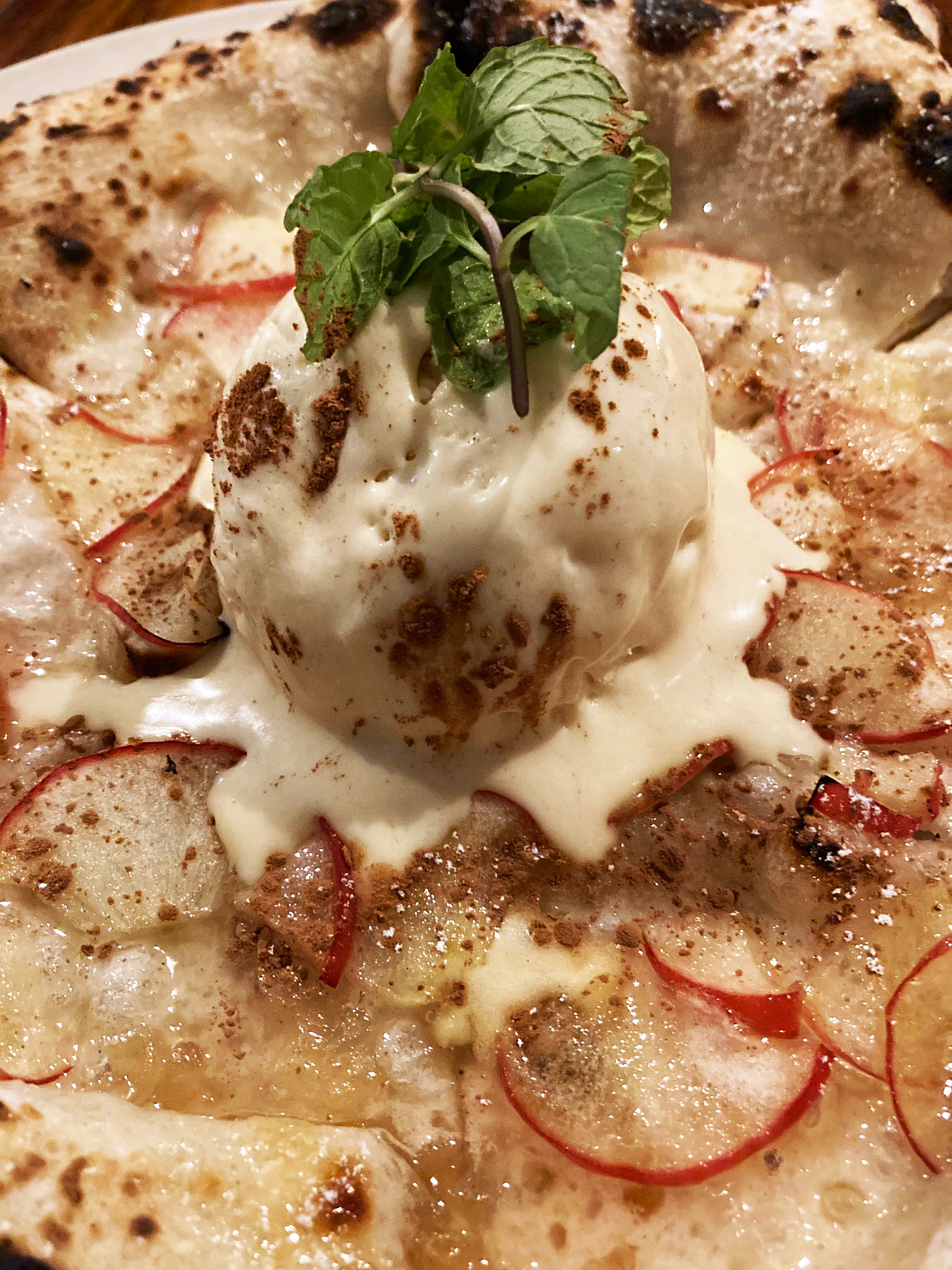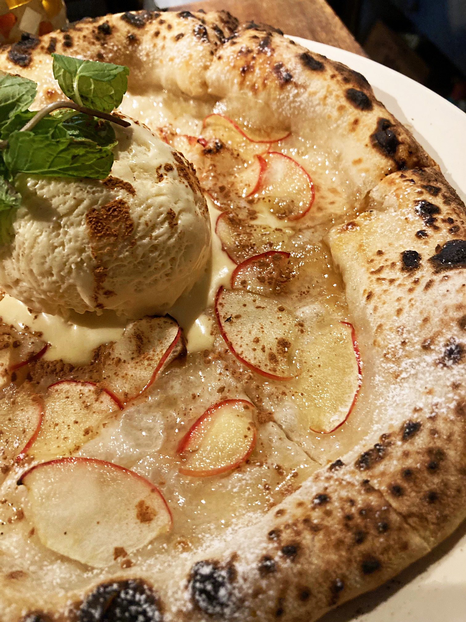 ピッツァ生地、マスカルポーネアイス、焼きリンゴのスライス、何もかもが当店自家製、特製ッ!。