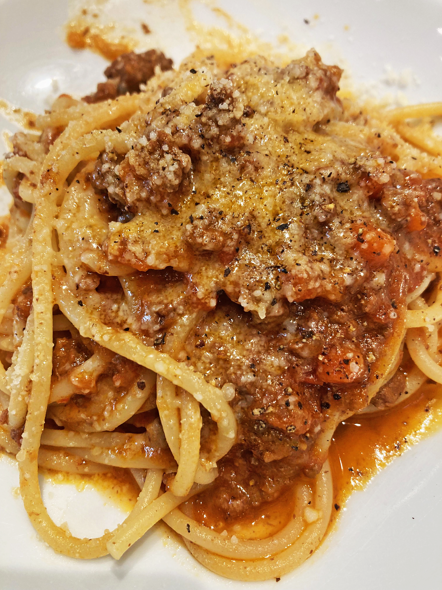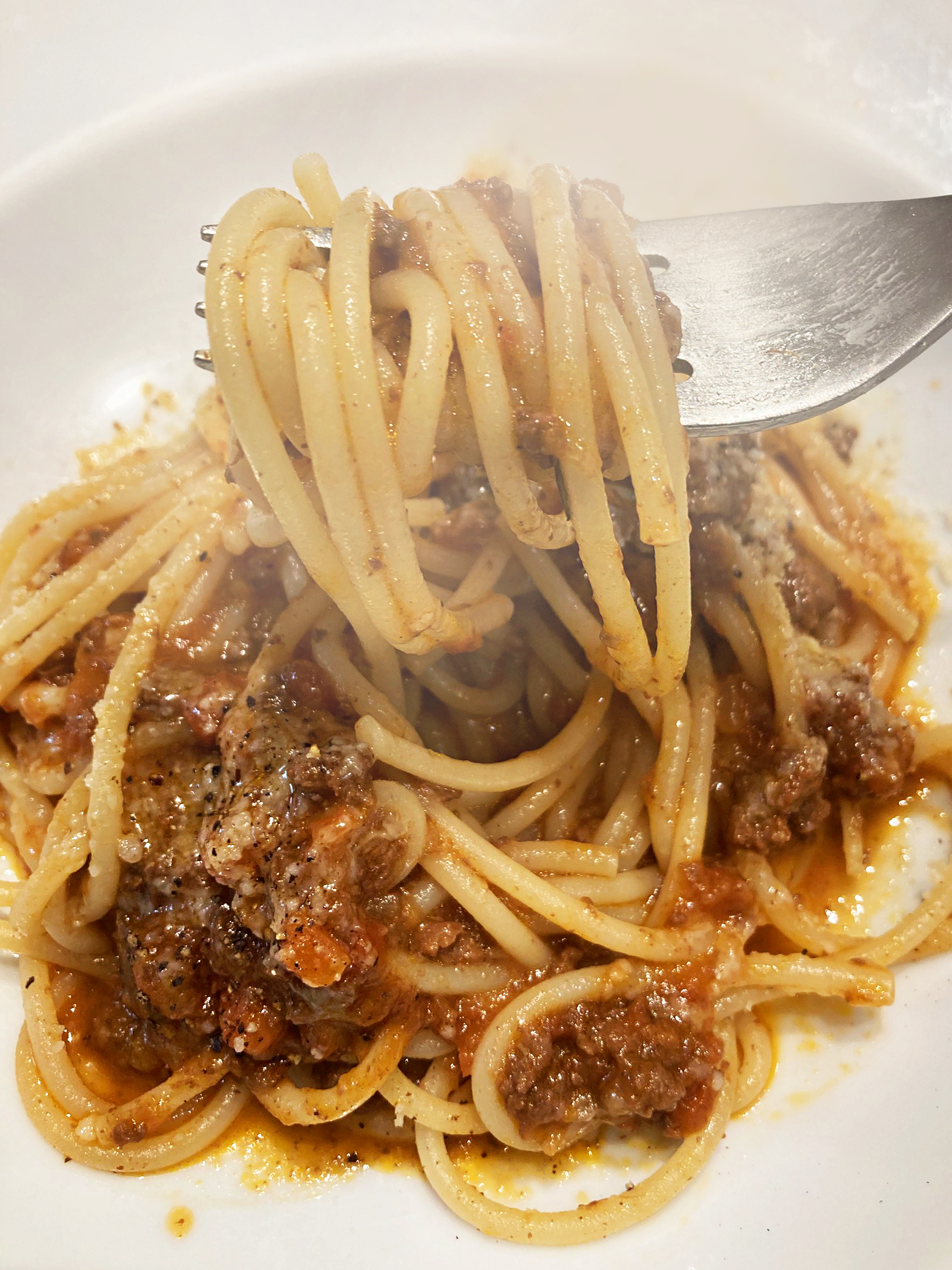 野菜と肉をじっくり煮込んで作った正統派なボロネーゼで間違いなヒッ。